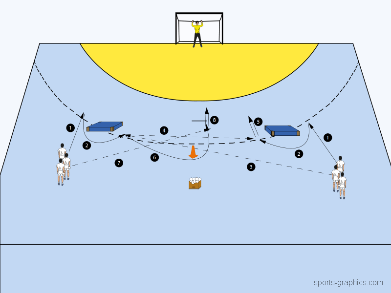Auf- und Umbau während einer Trainingseinheit kostet Zeit. Vor allem, wenn die Hilfsmittel Geräte aus dem Geräteraum sind. Daher soll in einer kleinen Serie aufgezeigt werden, wie mit einem Hilfsmittel gleich mehrere Übungen und somit große Teile der Trainingseinheit absolviert werden können. Heute: kleine Matten Übung 1: Torwart-Einwerfen als Handball Übung mit Matten Aufstellung: Die Feldspieler positionieren sich auf 9m, in zwei Reihen auf Torpfostenhöhe. Jeweils eine Matte liegt bei 7m. Jeder Spieler hat einen Ball. Ein Torwart steht im Tor. Ablauf: Im Vordergrund steht das Einwerfen des Torwarts. Die Übung