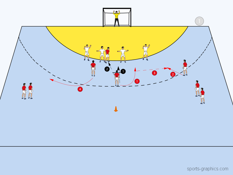Die Schwierigkeit der Durchführung liegt hauptsächlich bei den Laufaufgaben. Mit dem Ball werden nur einfache Aufgaben wie Prellen mit einer Hand oder Hochwerfen und Fangen mit zwei Händen ausgeführt. Währenddessen muss der Handballer aber z.B. bei jedem zweiten Schritt die Knie heben, verschiedene Schrittmuster ausführen oder Übungen des Lauf-ABC´s verbinden.