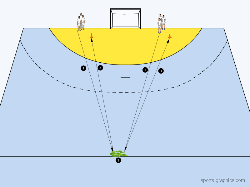 Die Feldspieler starten zunächst im Zik-Zak-Lauf Vorwärts zur 9m-Linie, Rückwärts zur 6m-Linie, wieder Vorwärts zur 9m-Linie usw. (1) bis zur anderen Außenecke des Spielfeldes (2). Danach wird das erste Hütchen angelaufen (3), das zweite Hütchen (4), das dritte Hütchen (5) und schließlich das vierte Hütchen (6). Das Tempo soll dabei von Hütchen zu Hütchen gesteigert werden. Nach dem letzten Hütchen startet die Gruppe aus der Außenecke auf dieser Seite.
