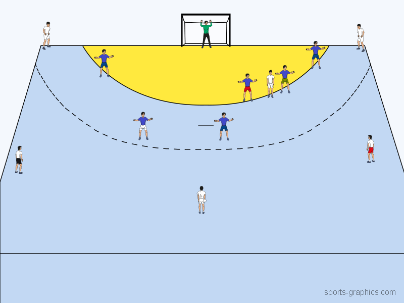 Die französische Mannschaft verteidigt in dieser Spielsituation mit Hinten Rechts und Innen Rechts offensiv bei fast 9m. Innen Links und Hinten Links verteidigen den Kreis.