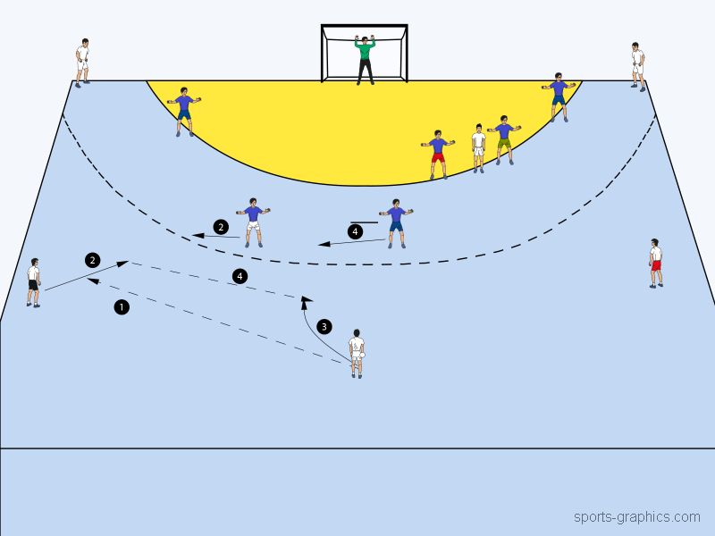Rückraum Mitte spielt den Ball zu Rückraum Links (1) in den Lauf (2). RM zieht Richtung 9m (3) und erhält den Ball von RL zurück (4). Rückraum Rechts macht das Spiel breit.