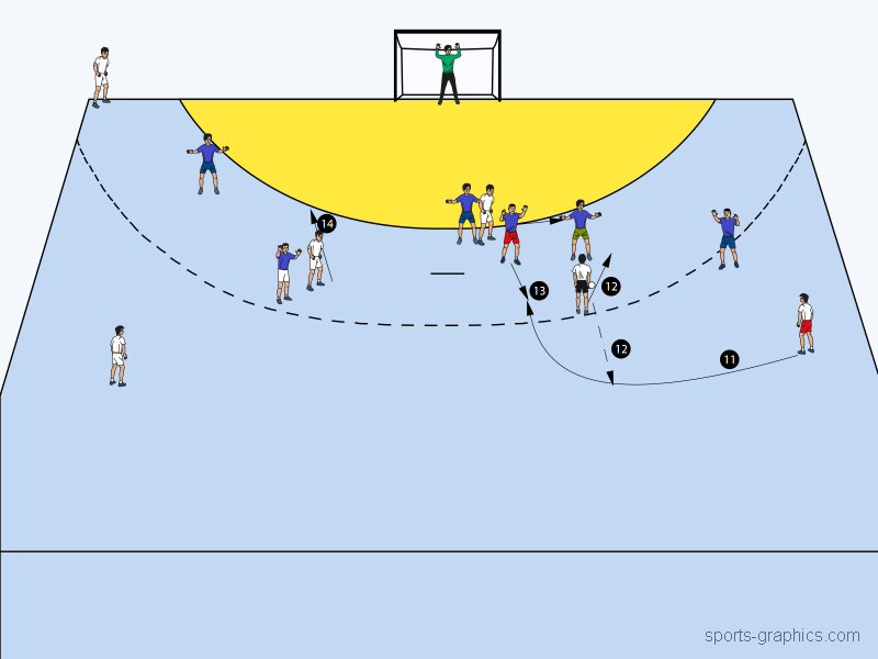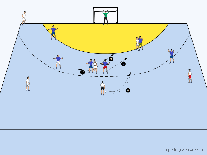 Dies gelingt aber nicht, denn sowohl IL als auch IR orientieren sich nun wieder defensiv in Richtung 9m (9). Der Kreisläufer wird von HL abgedeckt.