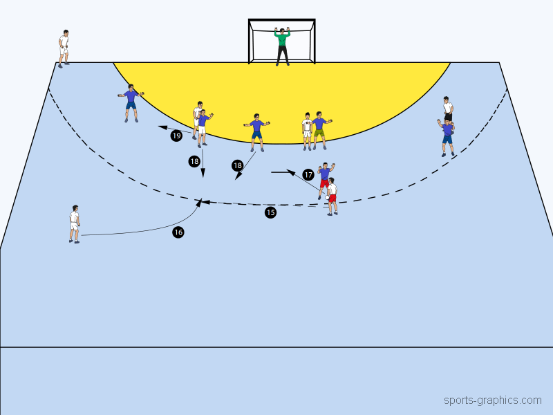 IL ist rechtzeitig gegen RR herausgetreten, so dass RR den parallelen Pass zu RM auf der Position Rückraum Links spielt (15). RM kommt im Bogen über die Mitte (16).