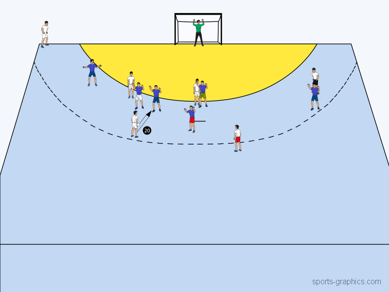RL hat den Ball und sieht sich HR und IR gegenüber, wobei HR den RA abdeckt und IR sich auf den Block konzentriert. IL deckt optisch den Raum zur Mitte und KM ab, während HL den Kreisläufer deckt.