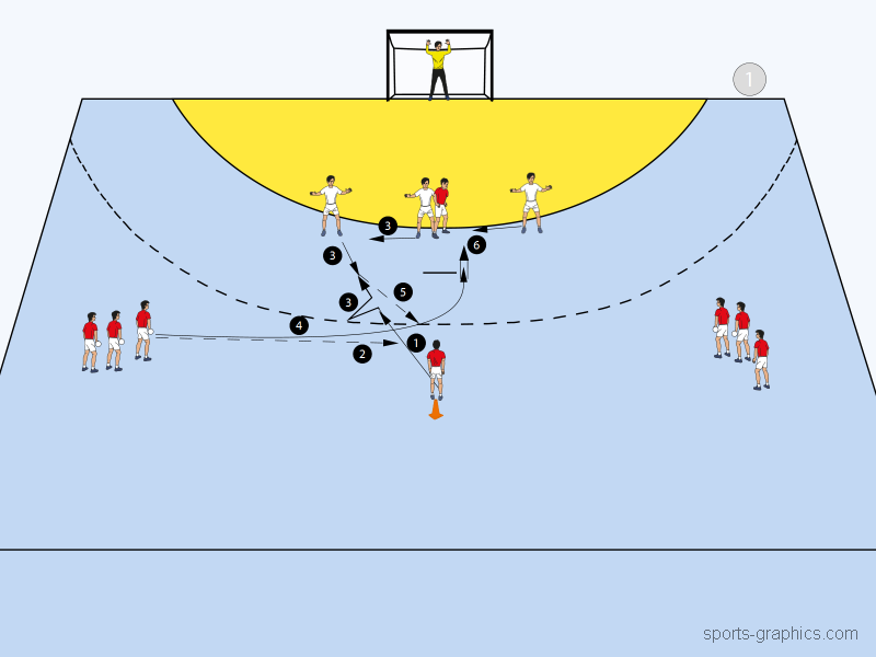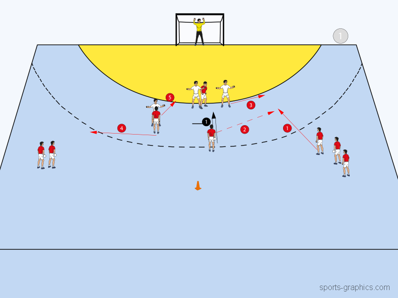 Als Erweiterung und zusätzliche Option ist nun aber auch ein Parallelpass möglich. RR startet dafür parallel zum RL (rote 1) und erhält den Pass von RL (2). IL muss nun den Durchbruch oder Torwurf von RR verhindern (3), während dessen gleicht derjenige, der das Kreuzen angezogen hat auf Rückraum Links aus (4) und IR zieht sich in die Abwehrformation zurück (5).