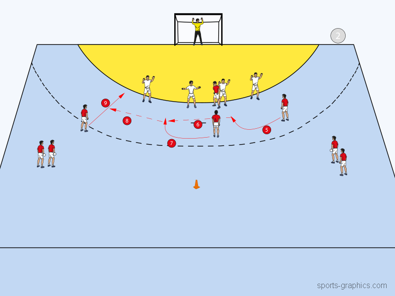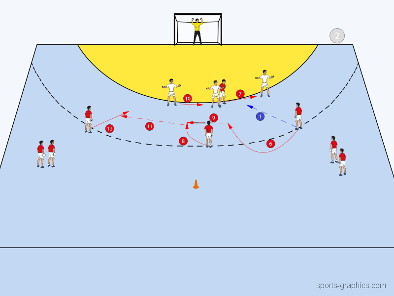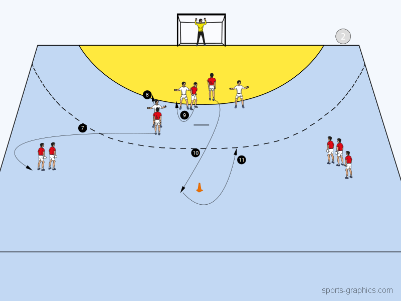 Nachdem RM den Ball an RL abgespielt hat, stellt sich dieser auf Rückraum Links wieder an (7). Fort an wird ohne RM gespielt. Denn während sich IR wieder in Abwehrformation einreiht (8) und KM die Seite der Sperrstellung wechselt (9), läuft RL, unabhängig davon, ob er selbst auf das Tor geworfen oder an KM abgespielt hat, in voller Geschwindigkeit zum Hütchen auf der Mitte (10). Dieses wird umrundet und RL läuft nun über die Mitte, um die Kreuzbewegung für RR zu eröffnen (11).