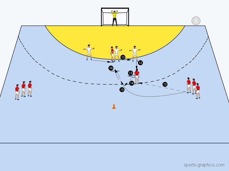 Nun läuft RL zur rechten Seite an und erhält den Ball von RR (12). Er vollzieht ein 1:1 gegen IR (13) und eröffnet somit die Kreuzbewegung für RR. RR läuft in einem Bogen über die Mitte (14) und erhält den Ball von RL (15). RR läuft weiter zwischen HM und IR, der Kreisläufer stellt eine Sperre bei HM an der Außenseite. Nun hat RR die Entscheidung, selbst zu werfen oder den Kreis anzuspielen (16).