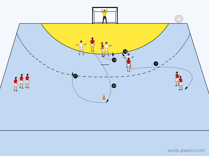 Nachdem RL den Ball an RR abgespielt hat, stellt sich dieser auf Rückraum Links wieder an (17). IL reiht sich wieder in Abwehrformation (18) und KM wechselt wieder die Seite der Sperrstellung (19). RR läuft unabhängig davon, ob er selbst auf das Tor geworfen oder an KM abgespielt hat, in voller Geschwindigkeit zum Hütchen auf der Mitte (20). Dieses wird umrundet und RR läuft nun über die Mitte, um die nächste Kreuzbewegung für RL zu eröffnen (21).